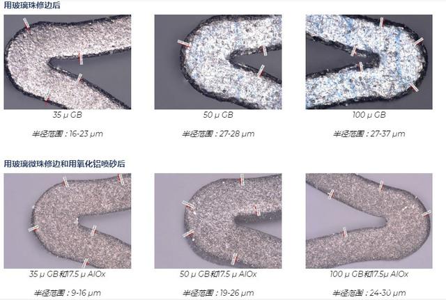 經(jīng)過吉川公司工藝工程師測試,用氧化鋁砂進行定向的噴砂處理可以去除氧化層,平滑表面缺陷并改善外圍支架的表面質(zhì)量。支架的受損區(qū)域很脆,但基礎材料鎳鈦諾卻具有延展性。氧化鋁噴砂磨料使用去氧化層,并且對韌性基體的侵蝕最小,從而在支架撐桿的整個長度上形成均勻的表面光潔度。 市場最新的支架設計和醫(yī)療植入物要求更大的邊緣倒圓角。圓形邊緣降低了被植入物卡住,其他風險的可能性。氧化鋁微噴丸的半徑為5-15 m,但新的幾何尺寸指定為接近25 m。該半徑可以通過三種途徑實現(xiàn):延長噴砂周期,使用更大尺寸的氧化鋁或完全使用其他磨料。通過測試,我們了解到更長的噴砂周期可以去除更多的團塊,而較大尺寸的氧化鋁會產(chǎn)生過于粗糙而無法拋光的表面。畢竟,氧化鋁顆粒的形狀為塊狀,邊緣稍尖。這給了我們一個可行的選擇:嘗試使用其他類型的磨料。為了克服這一障礙,我們測試了幾種類型的介質(zhì),發(fā)現(xiàn)用玻璃珠噴砂可以在拐角處形成所需的半徑(最大30 m),而不會除去設備的額外質(zhì)量。結(jié)果是氧化鋁的質(zhì)量提高了十倍。經(jīng)過吉川公司工藝工程師的測試事實說明了結(jié)果的差異。用氧化鋁噴砂處理過的樣品的半徑僅為8-13 m,而用玻璃珠噴砂處理過的樣品的半徑為24-30 m。 經(jīng)過吉川公司工藝工程師最終測試事實證明,最好的心臟支架噴砂工藝需要用氧化鋁砂粗噴砂、再用玻璃珠微噴砂是目前最好的一種噴砂工藝方式。 經(jīng)過粗噴、微噴的產(chǎn)品外徑和內(nèi)徑轉(zhuǎn)角處的半徑可以實現(xiàn),而所需的附加材料去除最少。半徑的大小可以有效地控制,因為它是基于圓形磨料,玻璃珠的大小和速度的。可以控制具有附加半徑的支架區(qū)域。通過機械加工表面,有助于保持支架的疲勞壽命。玻璃珠磨料通常用于必須保持嚴格公差的噴丸處理應用中。玻璃珠對支架表面進行噴丸處理,不會去除任何材料或數(shù)量可忽略不計的材料。如下所示,玻璃珠的尺寸很重要。玻璃珠的尺寸越大;邊緣越圓。玻璃珠有35 ,50 和100 兩種。讓我們看一下使用每種尺寸的樣本測試的結(jié)果。此處顯示的未噴砂的支架表面(500x)邊緣鋒利,并受到制造損壞。半徑范圍僅為3-8 m。為什么用兩種磨料處理比單獨用氧化鋁處理好? 玻璃珠無法消除制造過程中產(chǎn)生的浮渣,回彈和其他損壞;只有氧化鋁可以。氧化鋁不能產(chǎn)生真正的圓形邊緣。但是,它確實可以提供電拋光所需的理想表面光潔度。一個不能替代另一個。通過使用多步驟過程,植入物表面可以使用經(jīng)過驗證的相同設備獲得兩全其美的效果。在該過程中添加第二種研磨劑聽起來可能需要更多的勞動力,但實際上比其他修邊過程更有效。例如,電拋光可以產(chǎn)生較大的半徑,但它也會從整個零件中去除過多的材料,而不僅僅是角部,從而損害了支架的疲勞壽命。
