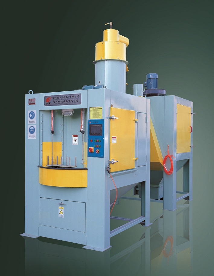 本設備是根據我公司針對轉動軸和處理要求而專門設計的轉盤式自動噴砂機,完全適合貴公司所提供的產品。根據貴公司對產品效率的要求,本機共大轉盤共設置4個區域(90度一個區域),每個區域設置2個工件裝夾工位。大轉盤每轉動90度區域一停,噴砂區域內共布置12支普壓高速噴砂槍,在噴砂區1個區域 2個噴砂加工位,各布置6支噴砂槍對工件需噴砂部位做擺動噴砂加工,噴槍可根據加工需要,隨意調整其噴射角度,其自動化程度較高。